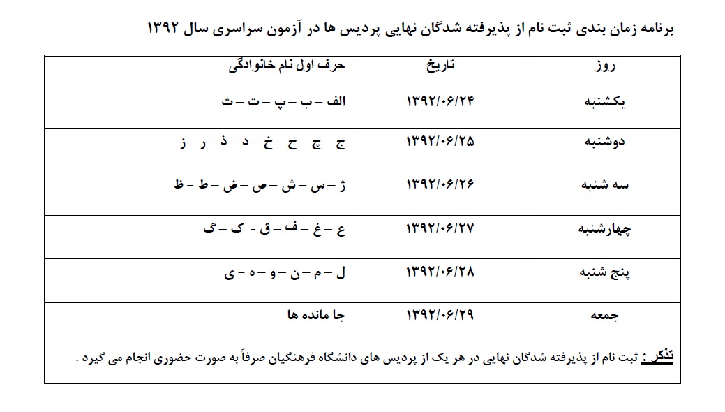 سراسری سال 1392 به منظور ثبت نام در پردیس محل قبولی با همراه داشتن مدارک لازم از مورخ 92/06/24 لغایت 92/06/29 طبق جدول ذیل بر اساس حروف الفبا به صورت حضوری مراجعه نمایند . لازم به ذکر است عدم مراجعه جهت ثبت نام در مهلت مقرر به منزله انصراف تلقی خواهد شد .