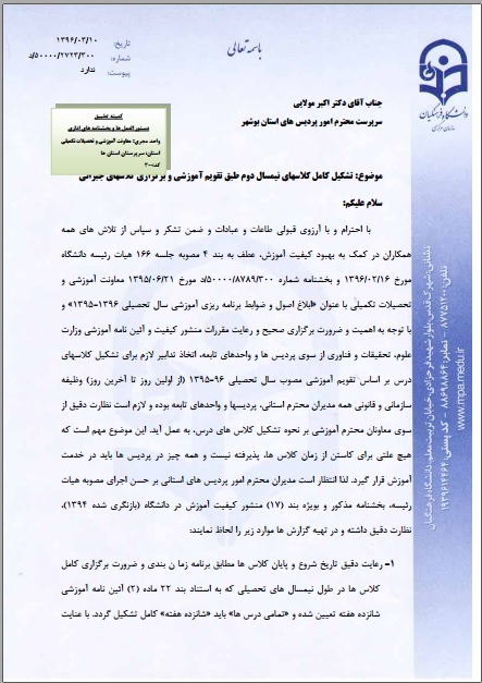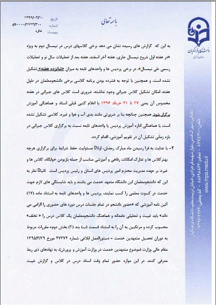 به استناد نامه شماره 50000/2723/300/د مورخه 96/03/10 سازمان مرکزی دانشگاه فرهنگیان تشکیل کلاس های جبرانی از روز شنبه مورخه96/03/27 لغایت چهارشنبه 96/03/31 طبق برنامه کلاسی نیمسال دوم برگزار خواهد شد.بدیهی است در صورت عدم حضور مطابق آیین نامه رفتار خواهد شد.