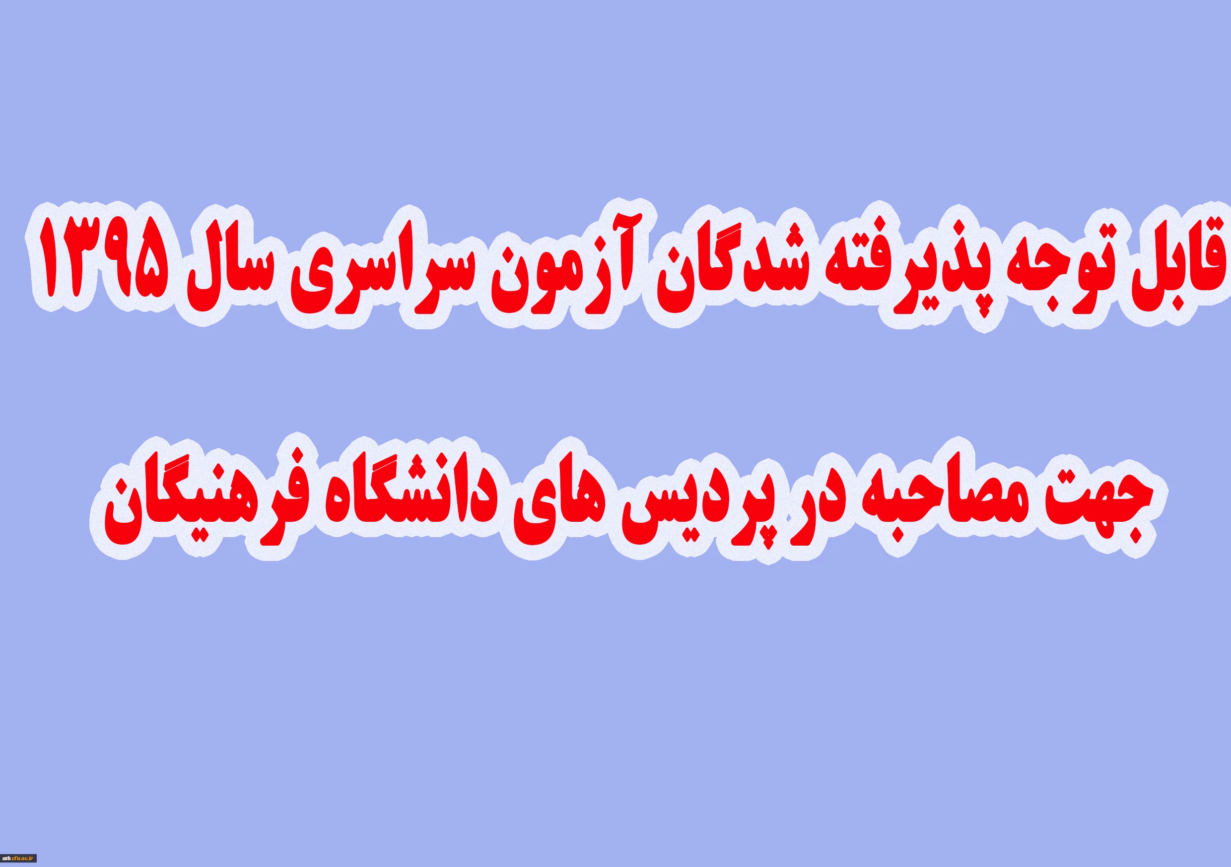 امتیاز دهید : قابل توجه داوطلبان گرامی مصاحبه سال 95 دانشگاه فرهنگیان 2 سهشنبه 9 شهریور 1395 ساعت 13:52